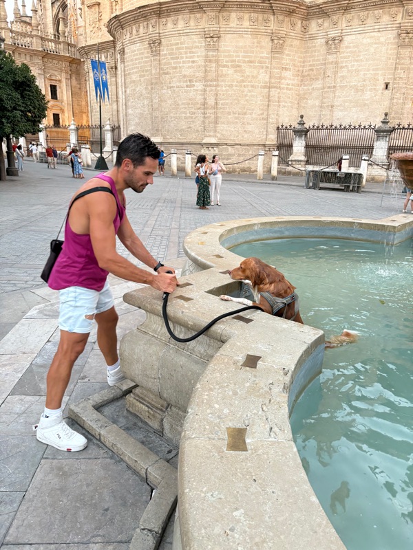 So it should come as no surprise that this evening, following an hour long bike ride, as we walked our Paseo through the Jewish quarter and passed the Giralda Tower we encountered a man walking a dog that suddenly and without warning started barking excitedly as if he had seen a squirrel or duck on the other side of the fountain that he wanted to chase after.