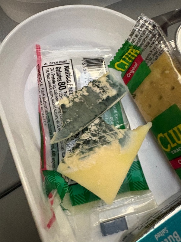 My airline dinner included a slice of cheese that I had finished half of before turning it over to discover the other side underneath covered in green mold! And no, this isn’t a special European variety. It was Vermont cheddar.